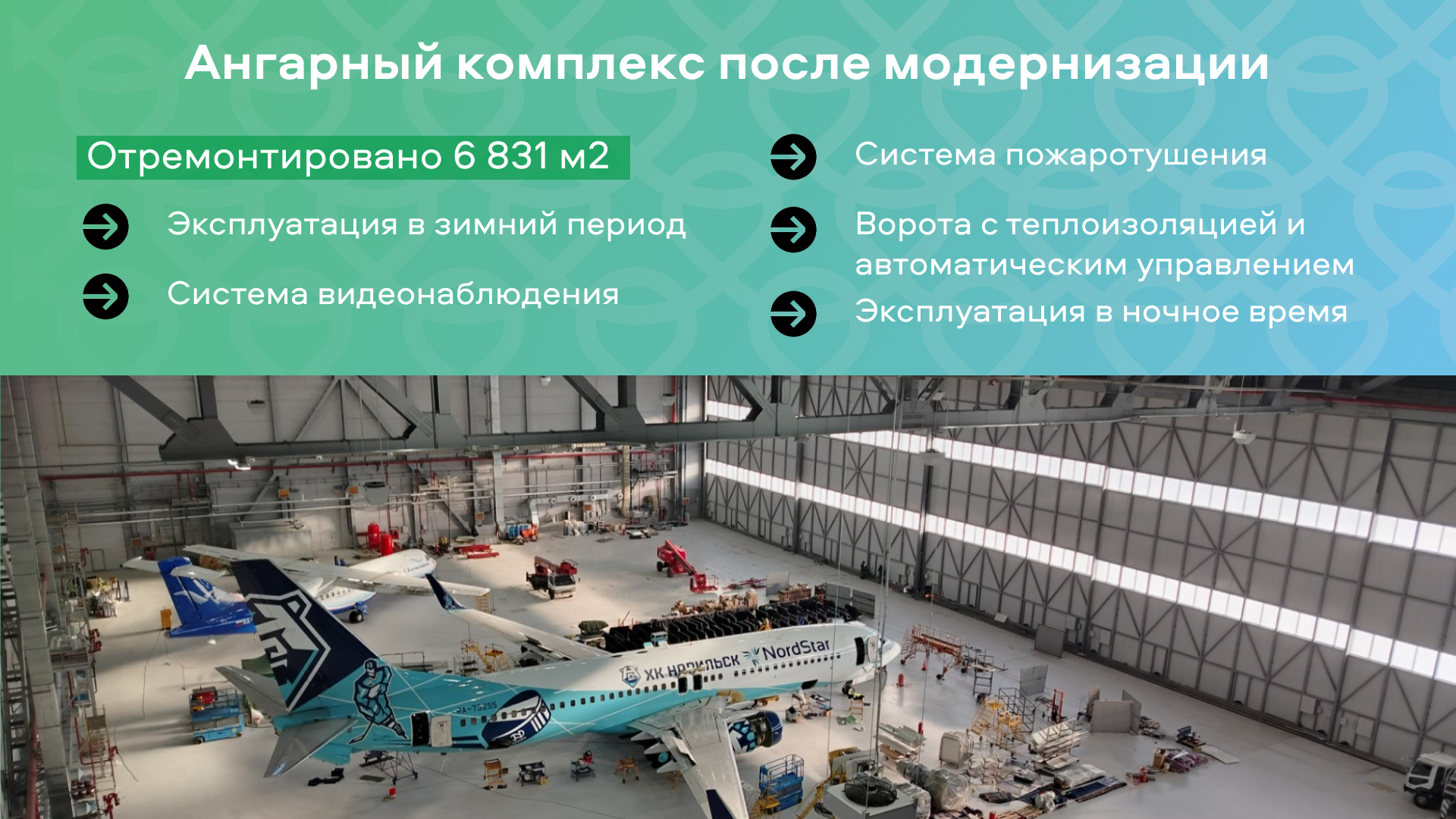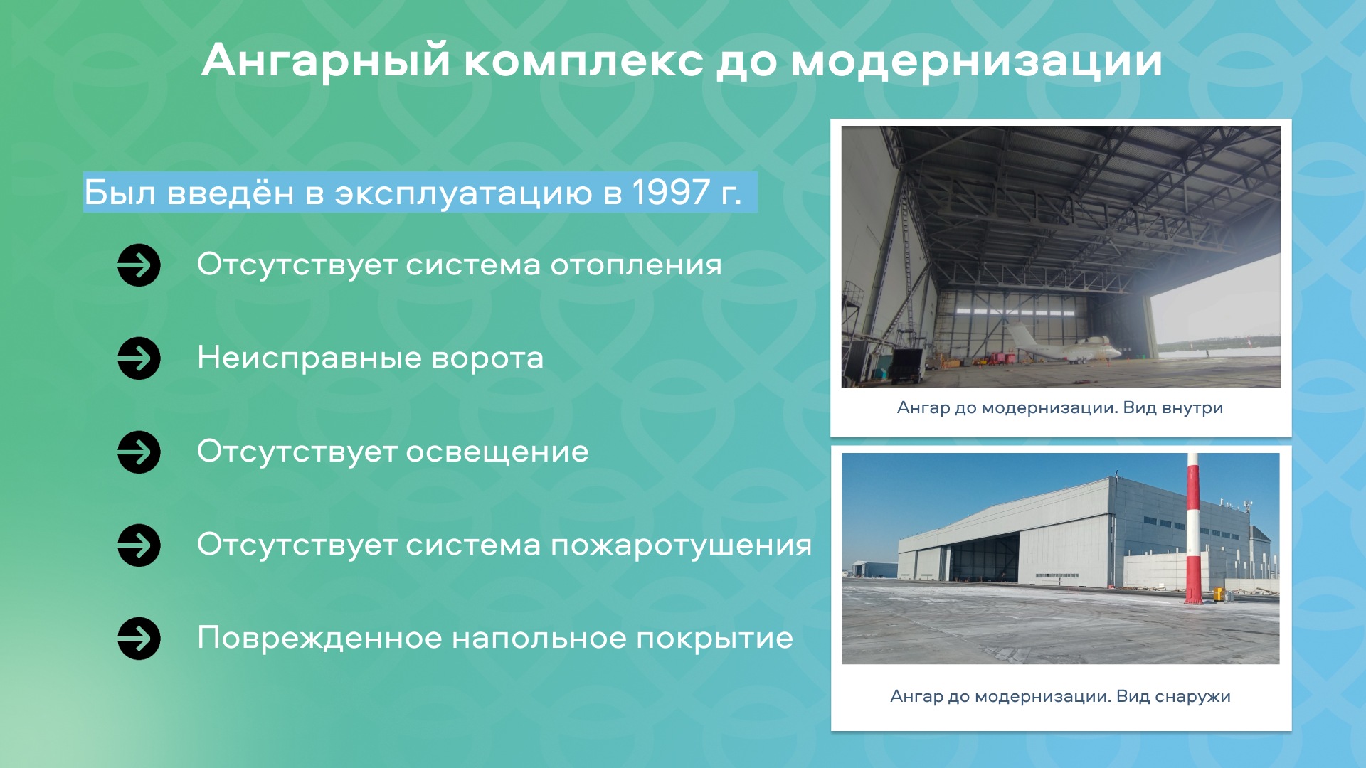 Капитальный ремонт полностью изменил возможности комплекса. Ранее ангар состоял из «тёплой» и «холодной» секции, которая фактически не использовалась в зимний период. Сегодня это единое современное пространство, готовое к круглогодичной эксплуатации.