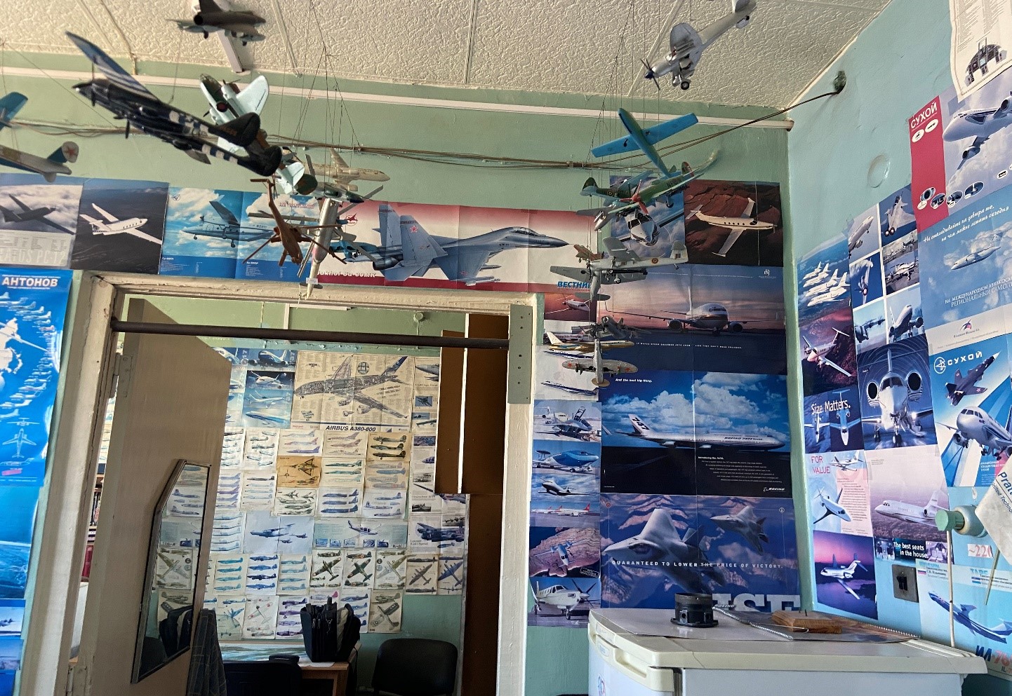 А еще за одной неприметной дверью царит волшебная атмосфера авиации. Десятки аккуратных вырезок и ярких постеров расположены на всех стенах, а с потолка, как на невидимых воздушных потоках, застыли в изящном полете модели самых разных лайнеров. И все это не просто украшение, а настоящая летопись авиации, собранная с любовью. И кажется, что сами стены здесь дышат полётом, создавая удивительную смесь высокой точности и романтики неба.